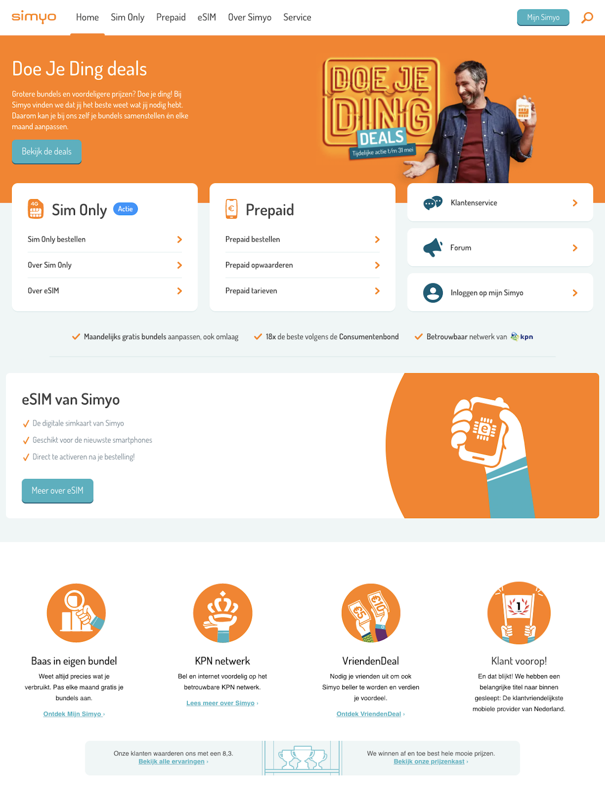 Simyo was de eerste volledig online telecomprovider. Eigenzinnig en volledig dedicated naar zijn klanten. Dat resulteert in een idioot lange koppositie als de beste mobiele provider. De Simyo klant is slim en kritisch. De copy is helder om meer vragen te voorkomen.